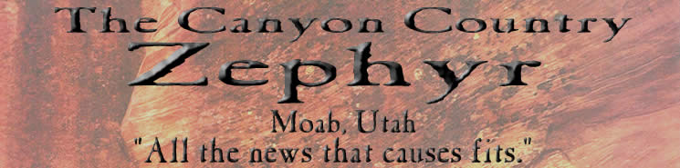 CONTACT THE ZEPHYR BY EMAIL: We didn't embrace technology for no damn reason at all. Let us hear from you. AND… if your email is meant to be a comment for publication in the next FEEDBACK section of the Zephyr, please say so. And you can always find us by phone, fax or snail mail: THE CANYON COUNTRY ZEPHYR P.O. BOX 327 MOAB, UT 84532 PHONE/FAX: (435) 259-7773 NEED A WEBSITE? Contact the Zephyr's webmaster for all your website design and maintenance needs. Email comments, complaints and requests to: |