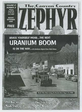 The next issue of the Zephyr will be online October 1st Featured Stories: TAKE IT OR LEAVE IT The End of Random Recreation...Moab's Unexpected Nuclear Option... Feedback from the Greening story...more by Jim Stiles POINTBLANK: My Apocalyptic Solutions for the 21st Century By Gary Ecshman THE ZEPHYR NUTSHELL RETURNS! Angry 'Dogs' of the Month...A Truck with Cajones... TRAM's GONE!!! The Last Fruit Tree... LOOKING FORWARD TO "THE GOOD OLD DAYS" Brace yourself Moab... The THIRD Uranium Boom is on the way. By Mark Steen LOSING SOLITUDE "Off Road" by Matin Murie REEL WORDS for the "real world." A departure from our favorite Westerns NETWORK By Paddy Chayevsky Depuy! The latest from The Master and another excerpt from Abbey's "Debris." THE DIMFORMATION AGE REPORTING from the CRAWL SPACE of HISTORY...notes from the desk of... ...NED MUDD THE RESURRECTION of FORT MOKI Another brief appearance on Lake Powell By Tom McCourt IS GRAND COUNTY 'ALIEN COUNTRY?' Chasing the 'Area 51' rumors in Utah By Ron Regehr SILVER BULLETS By Scott Silver THE ZEPHYR BACKBONE HERB RINGER'S AMERICAN WEST FEEDBACK: Extended Edition