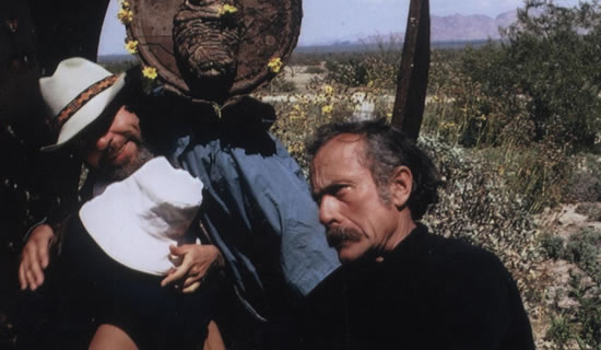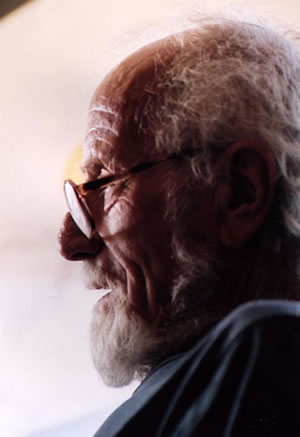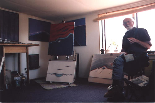 Depuy in his studio. He said, "You’re dying, you stay here with me and I’ll bring you back to life. He was 90 at that time." I stayed with him for almost twelve months and he taught me to be his assistant in the sand paintings and I would grind the paints then put them in the abalone shell and I learned to create the different pigments. He sent me on a spirit quest, fasting, sitting up on top of Navajo Mountain——I went out of my mind---the purpose of this, he told me was to find my spirit side. After a week of fasting, a week of sitting there, I started seeing all kinds of things. I don’t remember if it was reality or fantasy but a raven came and sat at my feet and then another day three coyotes sat with me. Finally I came down and told him about this. I asked him whether it was a dream and he said, "Those are your spirit guides Coyote and Raven...As long as you’re good to coyote and raven, you’ll be fine." He wanted me to marry his niece, who was a nurse in Tuba City but I was yopung, I wanted to go back to school, I wanted to paint, I wanted to live a whole life. He wanted to adopt me. He even gave me a Navajo name..I’m not even going to try to pronounce it, but it means Dawn Walker, but I decided, no, I’ve got to go back so I left and went to Santa Fe and I worked at Folk Art Museum. At some point the director of the museum wrote back East some information about me. A few days later, I came home and there’s a big black limo in front of my house and an aerial hanging out of it. He said, "FBI...Mr. Thoreau, you’re Mr. John Depuy." He hauled me off and threw me in the Santa Fe County Jail and then transferred me to the Albuquerque County Jail. The same jail as the one depicted in the film Brave Cowboy, the film based on Ed’s book. The same jail. The Navy was having a hard time getting my papers and meanwhile, I was rotting in this damn jail with a bunch a drunks, and killers. Finally, I said, I’ve got to get out of here and I started running up and down the aisles, yelling at the top of my lungs, "More guns, less butter! Man was made for war...Woman was made for procreation!" They decided I was off my bloody rocker, so they finally got the Navy to pick me up. I went to Corpus Christi first and then sent me back to the Philadelphia Naval Hospital. After a long hassle, they had a court martial and luckily they appointed a sympathetic shrink to decide why the hell I went and lived on the reservation; he asked me, "Why did you go live with the Navajo, what was that all about?" I said, "I was looking for God." And just handed this shrink a line of bullshit, about half of it true. Nobody would believe me, living with a hataali? Especially in 1952? And even before the trial I was foing watercolors in jail and the shrink liked my work. So, I went to the court martial and I’m sitting there listening to all this bureaucracy going on and then the day of judgement comes, just more crap and then I hear this guy stand up and say, "You are awarded 80 percent disability for life." Oh, my god, I was free, free! Then there was this GI Bill Public Law 16?, which was for disabled veterans…… So, you got your 80 percent disability…………. And I was free, free as a lark, walked out of that Naval Hospital, had the GI bill, I studied for a while with Hans Hoffman from the Bauhaus in New York. He was Bauhaus German, then I went over to Oxford from the GI Bill to do graduate work in art history. Ed Abbey went about that same time to Edinburgh because of Robert Burns. I spent some time there and then after wandering around, came a new wife, child born in Oxford and came back home.