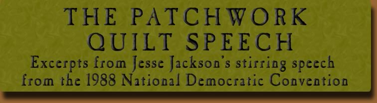 With so many guided missiles, and so much misguided leadership, the stakes are exceedingly high. Our choice? Full participation in a democratic government, or more abandonment and neglect. And so this night, we choose not a false sense of independence, not our capacity to survive and endure. Tonight we choose interdependency, and our capacity to act and unite for the greater good. Common good is finding commitment to new priorities to expansion and inclusion. A commitment to expanded participation in the Democratic Party at every level. A commitment to a shared national campaign strategy and involvement at every level. A commitment to new priorities that insure that hope will be kept alive. A common ground commitment to a legislative agenda for empowerment, for the John Conyers bill -- universal, on-site, same-day registration everywhere. A commitment to D.C. statehood and empowerment -- D.C. deserves statehood. A commitment to economic set-asides, commitment to the Dellums bill for comprehensive sanctions against South Africa. A shared commitment to a common direction. Common ground. Easier said than done. Where do you find common ground? At the point of challenge. This campaign has shown that politics need not be marketed by politicians, packaged by pollsters and pundits. Politics can be a moral arena where people come together to find common ground. We find common ground at the plant gate that closes on workers without notice. We find common ground at the farm auction, where a good farmer loses his or her land to bad loans or diminishing markets. Common ground at the school yard where teachers cannot get adequate pay, and students cannot get a scholarship, and can’t make a loan. Common ground at the hospital admitting room, where somebody tonight is dying because they cannot afford to go upstairs to a bed that’s empty waiting for someone with insurance to get sick. We are a better nation than that. We must do better. Common ground. What is leadership if not present help in a time of crisis? And so I met you at the point of challenge. In Jay, Maine, where paper workers were striking for fair wages; in Greenville, Iowa, where family farmers struggle for a fair price; in Cleveland, Ohio, where working women seek comparable worth; in McFarland, California, where the children of Hispanic farm workers may be dying from poisoned land, dying in clusters with cancer; in an AIDS hospice in Houston, Texas, where the sick support one another, too often rejected by their own parents and friends. Common ground. America is not a blanket woven from one thread, one color, one cloth. When I was a child growing up in Greenville, South Carolina and grandmama could not afford a blanket, she didn’t complain and we did not freeze. Instead she took pieces of old cloth -- patches, wool, silk, gabardine, crockersack -- only patches, barely good enough to wipe off your shoes with. But they didn’t stay that way very long. With sturdy hands and a strong cord, she sewed them together into a quilt, a thing of beauty and power and culture. Now, Democrats, we must build such a quilt. Farmers, you seek fair prices and you are right -- but you cannot stand alone. Your patch is not big enough. Workers, you fight for fair wages, you are right -- but your patch labor is not big enough. Women, you seek comparable worth and pay equity, you are right -- but your patch is not big enough. Women, mothers, who seek Head Start, and day care and prenatal care on the front side of life, relevant jail care and welfare on the back side of life, you are right -- but your patch is not big enough. Students, you seek scholarships, you are right -- but your patch is not big enough. Blacks and Hispanics, when we fight for civil rights, we are right -- but our patch is not big enough. Gays and lesbians, when you fight against discrimination and a cure for AIDS, you are right -- but your patch is not big enough. Conservatives and progressives, when you fight for what you believe, right wing, left wing, hawk, dove, you are right from your point of view, but your point of view is not enough. But don’t despair. Be as wise as my grandmama. Pull the patches and the pieces together, bound by a common thread. When we form a great quilt of unity and common ground, we’ll have the power to bring about health care and housing and jobs and education and hope to our Nation. We, the people, can win. To read a transcript of Rev. Jackson’s speech in its entirety, or to hear it via MP3, go to: http://www.americanrhetoric.com/speeches/jessejackson1988dnc.htm |