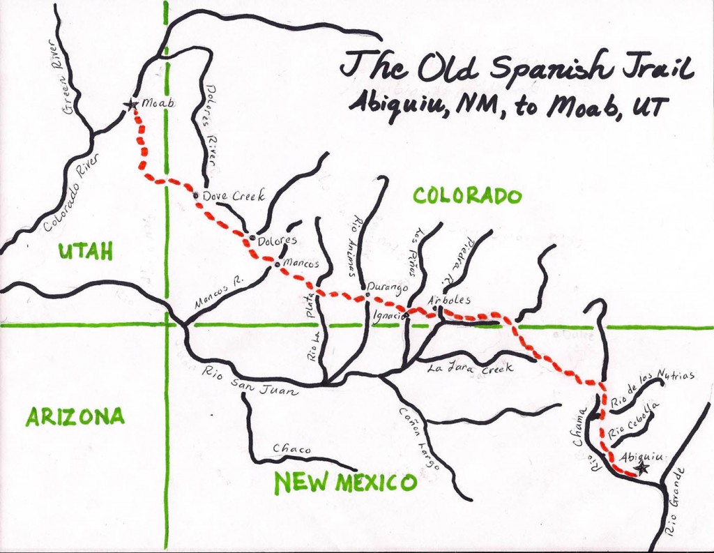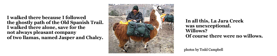 I walked there because I followed the ghostly path of the Old Spanish Trail. I walked there alone, save for the not always pleasant company of two llamas, named Jasper and Chalcy. These creatures had been impressed, with a steadily growing resentment, into carrying my gear and supplies for a month-long excursion along the historic path. Once trod by Mexican traders in the decades between 1828-1848, the Main Branch of the Old Spanish Trail, (which I was following), wound in a general northwesterly direction from its start in Abiquiu, New Mexico. It would hold this northwesterly course for some 400 miles until it reached Green River, Utah. Here the trail would swing west and then southwest in a great arc that would eventually bring it 1200 miles to its terminus in Los Angeles. I was hoping, over the course of the next few weeks, to walk the easterly section of the trail from Abiquiu to Moab.