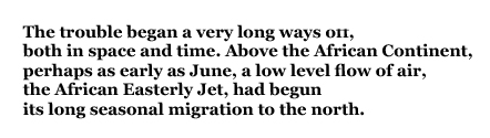 The trouble began a very long ways off, both in space and time. Above the African Continent, perhaps as early as June, a low level flow of air, the African Easterly Jet, had begun its long seasonal migration to the north. This low level stream of air is caused by a complex dynamic between temperature and soil moisture gradients that exist in the boundary between Saharan and sub-Saharan Africa. High above the dusty expanse of the Sudan, superheated air rose and began to create waves in the African Easterly Jet. These waves…subtle undulations in pressure…propagated westward across the Sahara, growing in intensity until they reached the Atlantic Ocean. These waves, now significant variations in atmospheric pressure, moved with a purposeful westwards motion across the tropical waters of the Atlantic.