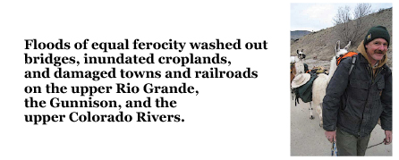 Floods of equal ferocity washed out bridges, inundated croplands, and damaged towns and railroads on the upper Rio Grande, the Gunnison, and the upper Colorado Rivers. Total damages across the region were estimated at around two million dollars in 1911 money. In the aftermath of the flood, the human structures were not only quickly rebuilt, but improved- ten years later, the flood was no more than a tale, told whenever a particularly dramatic downpour occurred, until the event faded from living memory.