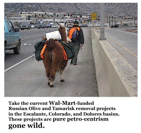 I will go so far as to suggest that all ongoing environmental remediation efforts are totally doomed. Take the current Wal-Mart-funded Russian Olive and Tamarisk removal projects in the Escalante, Colorado, and Dolores basins. These projects are pure petro-centrism gone wild. The plan is to use chainsaws and powerful herbicides, as well as trucks and heavy equipment, to remove pesky Russian Olive trees from the riparian habitat. I don’t know why, but chainsaws and herbicides never made it onto my list of ecologically friendly tools. Today’s economic dislocations, caused by a looming Peak Oil reality tell me that Russian Olive removal will cease as soon as the current grant funds are exhausted. Does the Nature Conservancy want to buy more cattle ranches? Does SUWA want to sequester more rangeland as wilderness areas? Guess what? All dollars are petro-dollars, and the money for these projects will run out long before the last barrel of oil is sucked out of the ground.