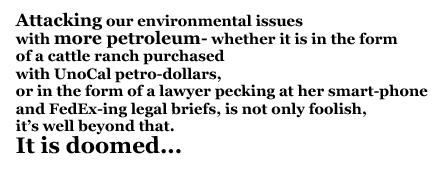 Attacking our environmental issues with more petroleum- whether it is in the form of a cattle ranch purchased with UnoCal petro-dollars, or in the form of a lawyer pecking at her smart-phone and FedEx-ing legal briefs, is not only foolish, it’s well beyond that. It is doomed, a relic of a bygone Gilded Age, and may not even last out the current decade. The end of cheap oil spells the renaissance of local, acceptance-based approaches to living on the planet. It sounds like a new and revolutionary concept, but it’s what traditional peoples have bee doing all along. “Working with” will replace “imposition on”, as the new environmental leitmotif.