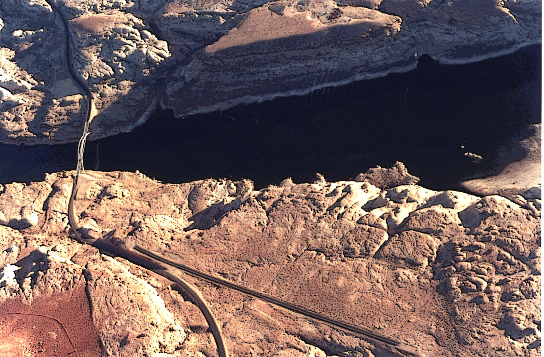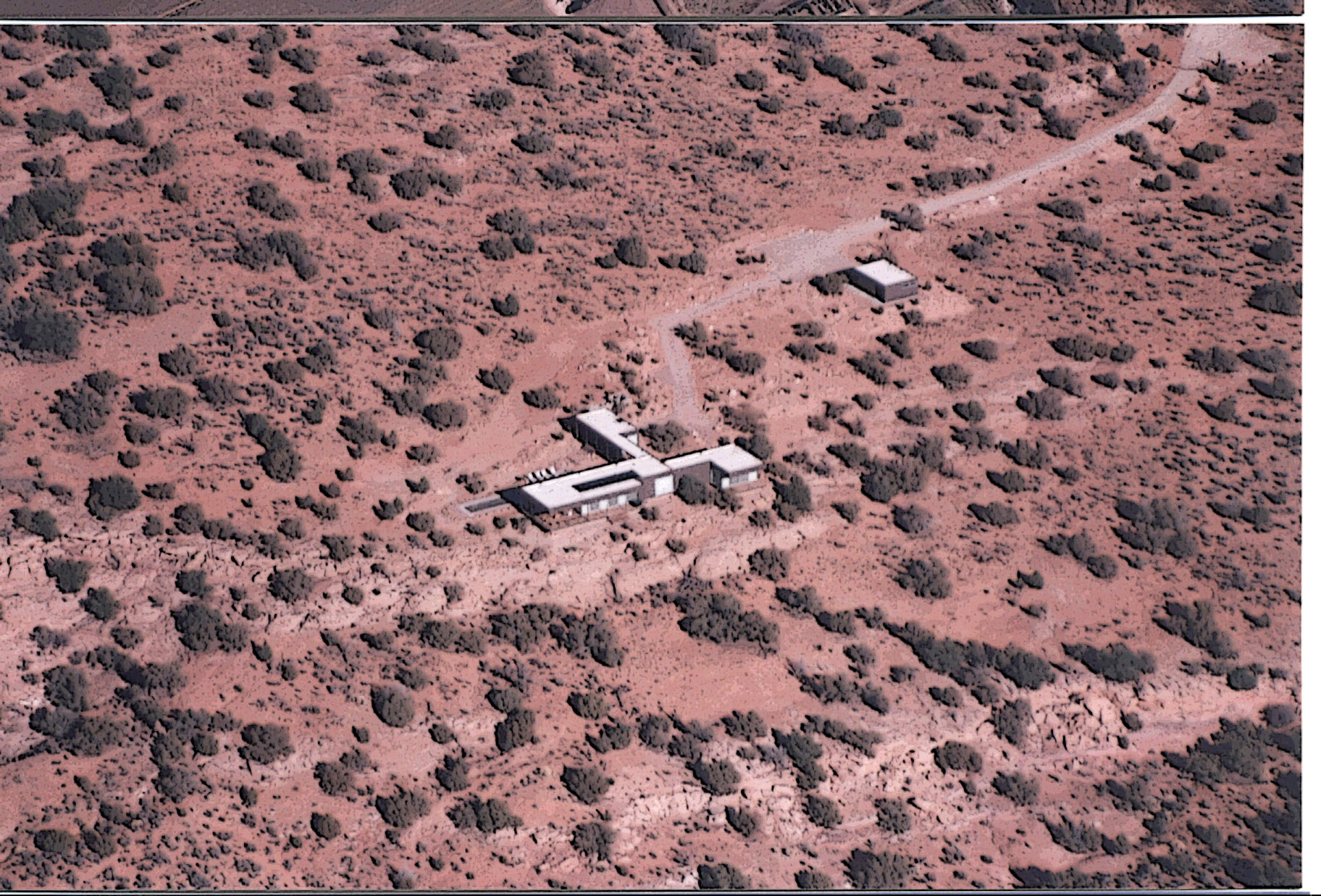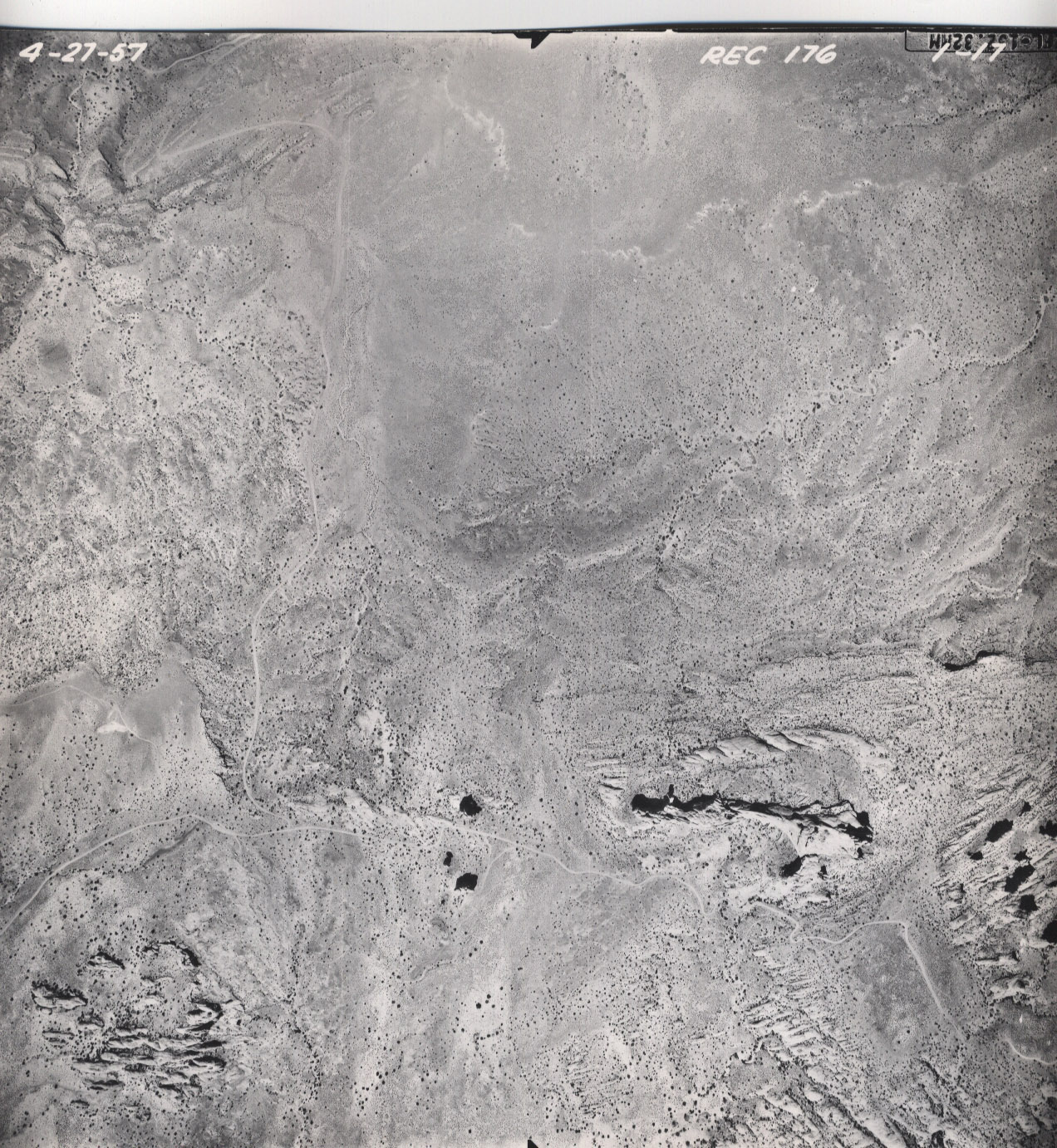 A 1957 aerial photograph of Arches National Monument, including Abbey’s trailer.