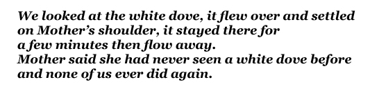 Felix G. Murphy died July 11, 1916. The day Grandpa was buried Mother, Mary and I were looking at the clouds and watching for the sunset, the clouds were fluffy and beautiful, the kind that makes pictures in the sky. Mother said “Oh no.” I looked up at the clouds they had changed while I was watching a white dove that lit on a bush close by. The picture in the clouds looked like a funeral procession, the sun was getting low and started tinting the clouds. They gathered together all in one place as we watched then they broke up and went away. We looked at the white dove, it flew over and settled on Mother’s shoulder, it stayed there for a few minutes then flow away. Mother said she had never seen a white dove before and none of us ever did again.