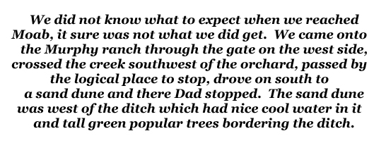 We did not know what to expect when we reached Moab, it sure was not what we did get. We came onto the Murphy ranch through the gate on the west side, crossed the creek southwest of the orchard, passed by the logical place to stop, drove on south to a sand dune and there Dad stopped. The sand dune was west of the ditch which had nice cool water in it and tall green popular trees bordering the ditch. There was a grassy spot on the other side too. Dad just drove up, unhitched the horses from the wagons, hitched one team to the buggy so Grandma could drive down to her house. Dad took the other teams to the pasture and that is the last we saw of him for several weeks.