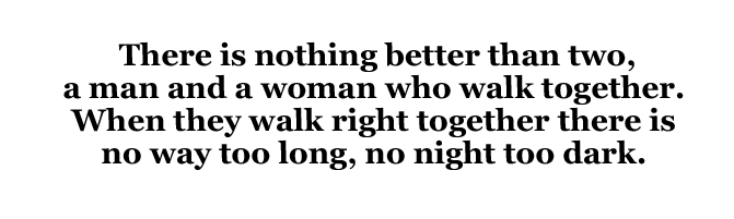 There is nothing better than two, a man and a woman who walk together. When they walk right together there is no way too long, no night too dark.
