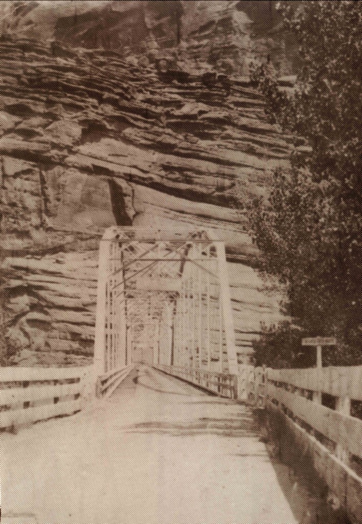 When the cows were all together again we drove them down Moab Canyon toward the river bridge. The first mile we picked up what was left of our camp outfit. That pack horse just rubbed against a tree until the pack was loose enough to turn underneath him then he kicked it to pieces. The bridge was narrow but traffic was slow, when we got the herd across the river we drove them through the town and up to the Murphy ranch. The valley was fenced off and that was the only way we could go.