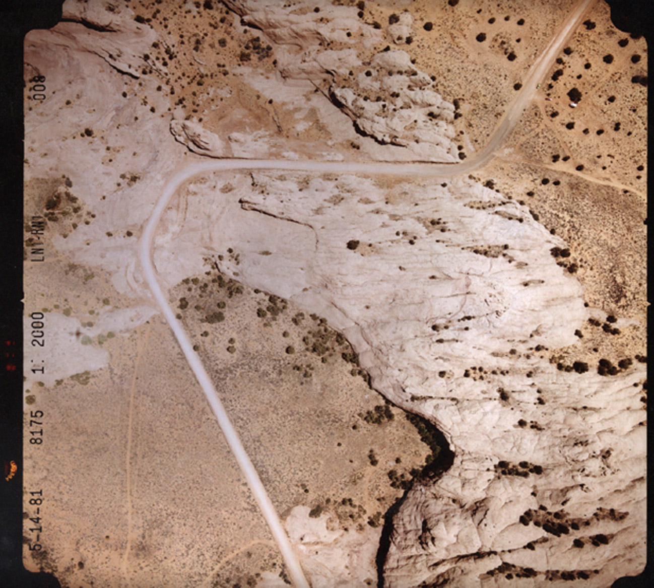 In the early 198s, soil scientist Lynn Fenstermaker conducted soil tests near the Sand Flats above Moab. At the time, there was scarcely any human presence and her soil transects were established to determine the impact of cattle grazing on the local vegetation and soil. The aerial photo dated 5-1-81 shows the status of the land as it appeared then.
