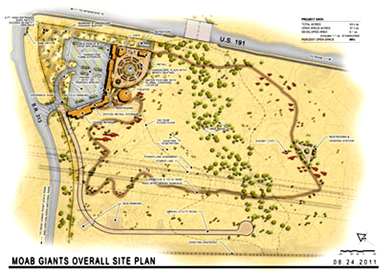 And just last week, the Moab Times-Independent ran a story about another proposed theme park to capitalize on Moab’s tourist economy. Called “Moab Giants,” the new project calls for the construction of “an open-air dinosaur museum and park north of Moab.” According to the story, “The main buildings at the facility will be used for an indoor museum, retail sales and concessions, including a 76-seat café area, exhibit storage, and offices for visiting scientists and park operations. There will also be a 50-seat theater where patrons can learn about the history of the land in the area.