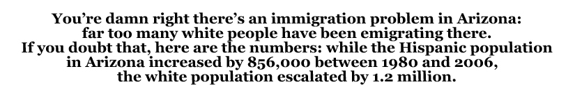If you doubt that, here are the numbers: while the Hispanic population in Arizona increased by 856,000 between 1980 and 2006, the white population escalated by 1.2 million. (Population
