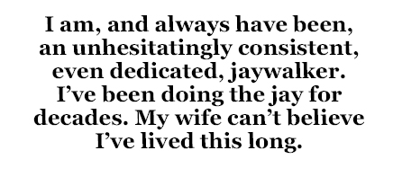 I am, and always have been, an unhesitatingly consistent, even dedicated, jaywalker. I’ve been doing the jay for decades. My wife can’t believe I’ve lived this long. I maintain that the shortest distance between two fixed points is a straight line (mathematicians will support me on this) and I have adhered to that rule for most of my life. I still do.