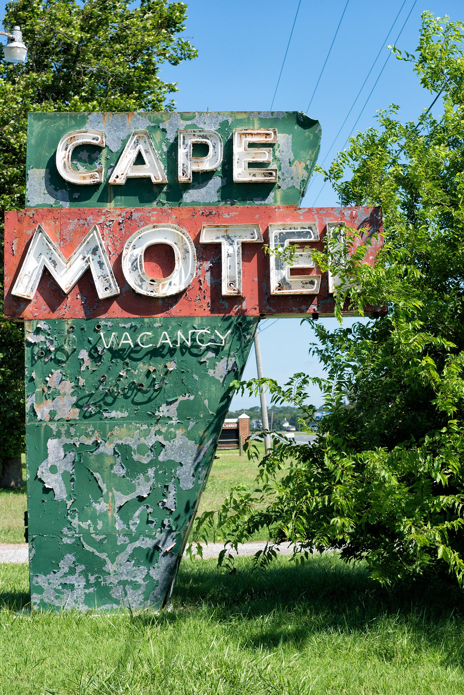Somewhere on the southern tip of the Delmarva Peninsula. The typeface, the colors, the inverted airplane wing shape. It’s all there. What the hell would that typeface be, anyway? I see it so often on these ancient sign remnants. “Mid-century American Motel?” I’d love to get a hold of it. Any font people out there who can recommend an analog? I used to be a font person, back in the days of Prestype and Letraset