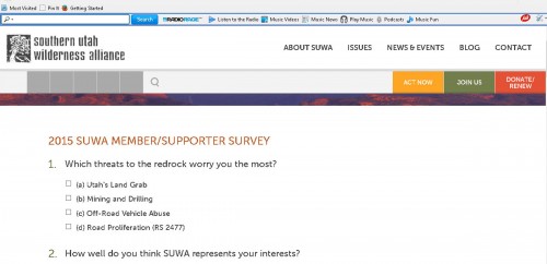In fact, it appears they don’t believe a problem exists at all. In a recent “2015 Members/Supporters Survey,”  the Southern Utah Wilderness Alliance, Utah’s flagship environmental organization, wrote to its members, “Your support and advocacy is crucial to our success in protecting the redrock, so please take a few minutes to give us your feedback.” The first question defined the scope of the group’s concerns when it asked: