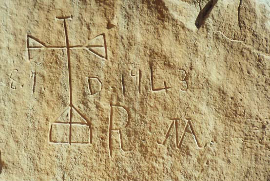 At MULE CANYON, south of Moab, travelers paused here to record their passing. Among the names is ‘GEO. FOX,’ who carved his name on at least three locations along the current right of way of US 191, including one signature just inside Arches National Park.