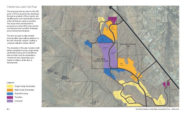 Some of the plan, if implemented, could actually shift the core of Moab to the campus location, a couple miles south of its business district. The 40 acres of land upon which the university will be built was originally owned by the State Institutional Trust Lands Administration (SITLA), but the adjacent SITLA property will also be developed and administered for commercial and residential growth.