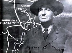His permanent career began with the National Park Service as acting superintendent of Organ Pipe Cactus National Monument, in Arizona. Interrupted by World War II, he served in the Navy Seabees and then returned to the Park Service at El Morro National Monument, in New Mexico. In 1949, Bates and Edie, his first wife, and their family were transferred to what was then Arches National Monument. This event certainly marked a turning point in his life.