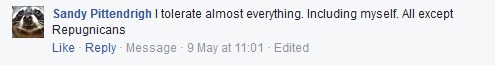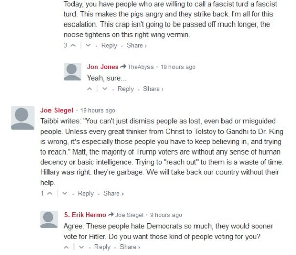 I would love to think that this sort of commentariat conflagration was an isolated event, but I keep seeing the same vitriolic hatred of Republican voters in the comment sections of News articles, in blog posts, and, of course, all over Facebook. The word “delusional” popped up a lot, as did “stupid,” “moronic,” “fascist,” etc. These insults weren’t aimed at politicians, at actual Neo-Nazis, or public figureheads for any Conservative groups. No, these slurs were aimed at ANYONE who voted Republican, anywhere, in any race, across a country of more than 320 million people.