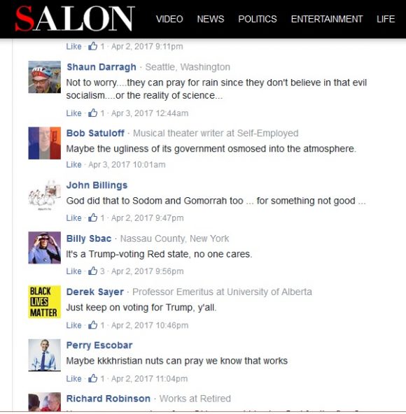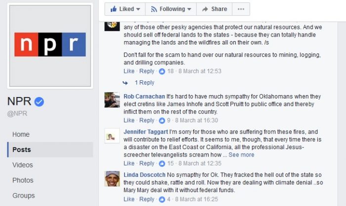 But, when the news of our wildfires finally reached some national media outlets, the comment sections were filled with exactly the sort of people I encountered under the “Tolerance” article. Because we live in Kansas, or Oklahoma, many commenters took their chance to make jokes about Trump voters, to rail against our politicians for not believing in Climate Change, or to openly state, based on the political bent of the locals, “I have no sympathy for these people.”