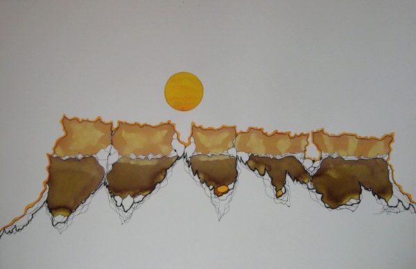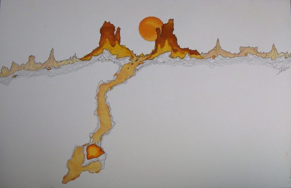 His line and ink drawings and oil paintings represent clearly, recognizably, the landscape of the Southwest – mountains, buttes, abysmal gorges. But De Puy’s landscape is not he landscape we see, but the one, he claims, is really there. A world of terror as well as beauty that lies beyond the ordinary limits of human experience, that forms the basis of experience, the ground of being.”