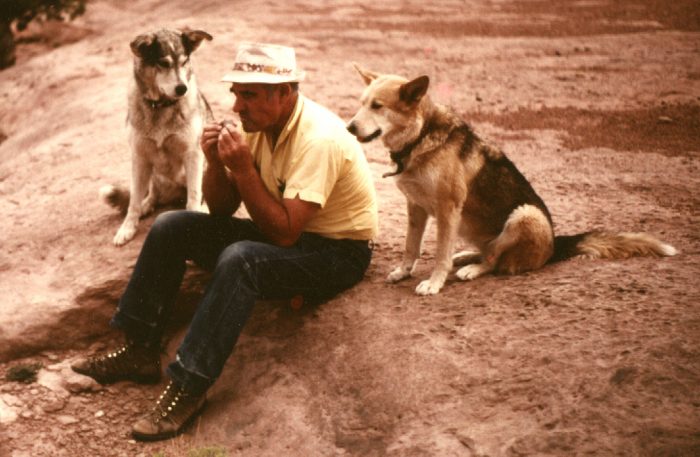 Reuben became as familiar a sight at Arches National Park as the park itself. One spring, I discovered that my beloved dog Muckluk had terminal cancer. The greatest veterinarian and one of the best men I have ever known, Dr. Don Hoffman, did all he could for her and she had a wonderful last summer, digging holes, chasing jackrabbits,and eating. But in early October, Muckluk took a turn for the worse. When she passed up a sirloin steak, I knew she was tired and ready to go. Dr. Don gave up his day off and drove to the Devils Garden campground so her last memory would be in familiar and happy surroundings. It was one of the toughest days of my life. Reuben, of course, was there. When Don inserted the syringe into Muck’s paw, I was holding onto her. Reuben was holding onto me.