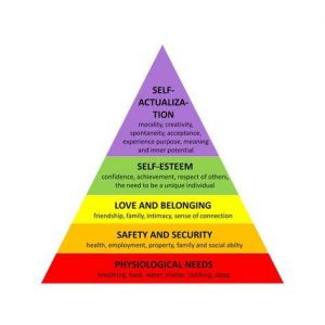 One of the few ideas that stuck from my college psychology courses was Abraham Maslow’s theory of the Hierarchy of Needs. Maslow expressed the vast complex of human motivation as a triangle, with the most basic of human needs on the bottom and successive rungs of less and less pressing needs as the sides converged to the top. Those bottom needs, the most basic needs, like food, shelter, and clothing would need to be satisfied before a person would be motivated to act on behalf of the next rung of needs, which included personal safety and health. After that rung came social belonging, then esteem, followed by self-actualization and, finally, self-transcendence. Like most successful psychological theories, it seems obvious to the point of triteness when you think about it. If you ask a starving man to choose between a hot meal and literally anything else, he will choose the hot meal. Once he’s fed, then he’ll start to wonder how he can keep himself fed and move to the next rung of the hierarchy, seeking safety and security. Only after he knows where that next meal is coming from can he start to look around and think about his community and how he might fit into it.