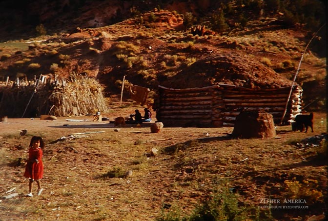 A Navajo hogan and little girl at play in Canyon de Chelly. 1963