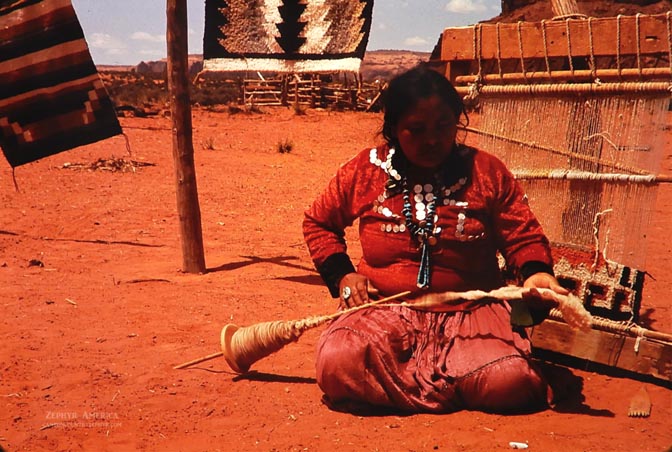 Weaving a blanket the time-honored way in Monument Valley. The Three Sisters are in the background. 1965