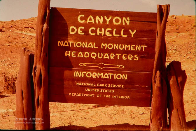 The entrance sign to Canyon de Chelly National Monument. Be advised that like many others who made the same mistake, including me over 40 years ago, “Chelly” is pronounced Shay, not Shelly. Summer 1963