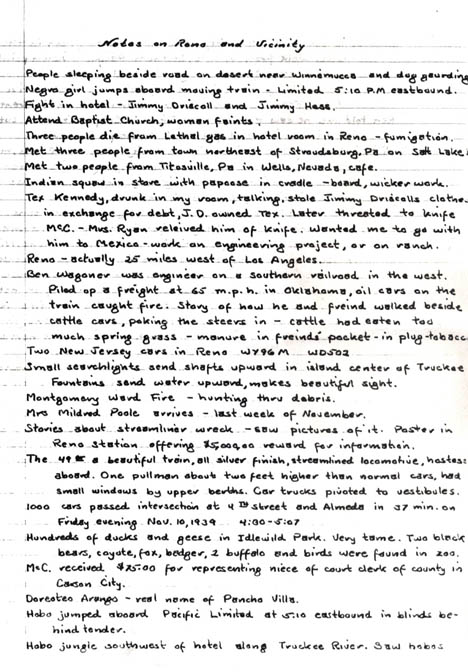 As he awaited his divorce to be finalized, he took up residence again at the MidWay Hotel. He kept a running list of “incidents” in a handwritten document called “Notes On Reno & Vicinity.” Here’s the first page and a link to the rest of them: