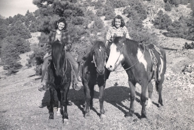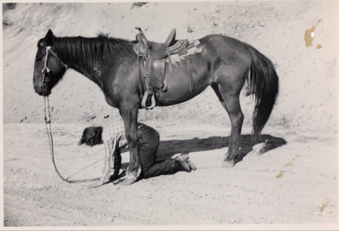 “Yes!” he smiles, “That’s Skippy. That was in the High Sierras in about 1942. She loved her horse and the horse would do anything for her. She bet me she could sit right under it and I didn’t believe her. So she climbed down and crawled right under the horse’s front legs. So, I took a picture. And that night I bought her a steak dinner.”