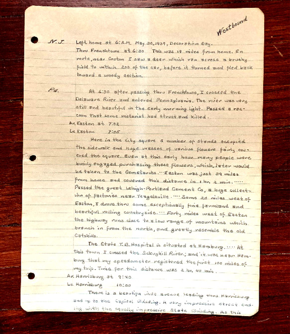 On Memorial Day Weekend, he left Ringoes and began a 2500 mile journey across North America to Nevada. As he traveled he kept meticulous notes–you can see the first page here —-not only are his descriptions of the land beautifully composed, almost poetic, but his penmanship, written with an old ink fountain pen, is so beautiful, I would see little point in transcribing it to type. Someday I may post the entire journey, as Herb wrote it. It is a beautiful description of a week in the United States, in the late Spring of 1939.