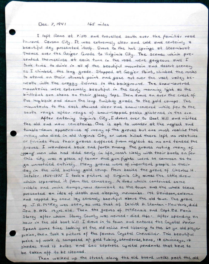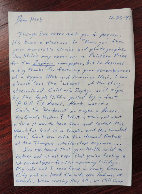 The ritual continued, and in 1989 I started The Zephyr. From that first issue, I made good use of Herb’s gift of old photos, but I was on a budget of my own and could not afford to post his magnificent Kodachromes in color. It would be more than a decade, with the advent of the internet and The Zephyr website, that anyone had ever seen his pictures as they were meant to be seen. Still, he was thrilled to see his pictures and some of his journal entries, going back to the late 1930s. He had even recorded, in his impeccable penmanship, the day he went exploring a ghost town and came home that evening to see the newspapers. It was December 7, 1941. Pearl Harbor.
