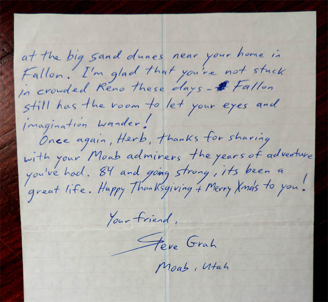 By the mid-1980s, Herb was a familiar face and when he passed through the Arches entrance station, I’d often get a call on the two-way radio that my “buddy Herb is on his way up.” Finally, a friend and I decided it was time to visit Herb. Our trip was planned for mid January, but her sudden death and the grief that all the park staff felt put an end to the journey. Because Herb was only in Fallon for three or four months a year, he didn’t have a phone. I had to write him a letter to break the news to him. He responded immediately, again overwhelmed by the loss that he shared as well. It was one of the hardest times of my life.