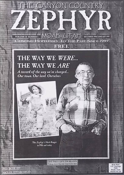 In 1998, December 11th fell on a Tuesday. That was “Zephyr Press Day” for me. With Herb on my mind, I featured him on the cover, with a photograph of him as a four year old boy, and another from the past summer. The Zephyr was printed in Cortez, Colorado at the time. The December/January issue was loaded into the back of my pickup and I made the two hour drive back to Moab. An hour after I arrived, the phone rang. It was Pat. Herb had just died.