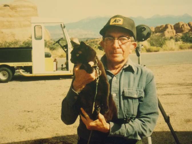 I met Herb in the summer of 1981, and at the time, would never have guessed that I’d still be writing about and remembering his role in my life, more than 40 years later.. I was the campground ranger at Arches National Park. In those days, we walked site to site to collect the daily fee. To this day, some of the best friends I’ve ever known were born during those personal contacts. I still remember walking up to his white Ford Econoline camper van at site #22…there was Herb. He was sitting in a lawn chair in the shade of a juniper tree; beside him, on a leash, was a Burmese cat that I later learned he called Namtu.