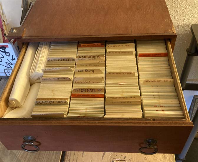 Many months later, in the autumn of that year, I was sitting in my living room, bored to death and watching tv, when the memory of that paper sack made its way to the front of my brain. I had to think for a moment to remember where I’d put it. I found the bag and peered inside. In neat bundles, wrapped in rubber bands, and labeled by location, were several hundred Kodachrome color slides. I pulled out my father’s old Tower slide viewer and started looking at each collection. Herb had never even told me he shot photographs like this, or that he’d used Kodachrome film. Or that he’d been taking Kodachromes almost from the day the film became available to the public, back in the 1940s. Now in his 70s, Herb had finally given up his more expensive cameras that I didn’t even know he owned, and had resorted to a simpler point-and-shoot. Now, for the first time, I saw these amazing images. I expected to see him soon and sure enough, he arrived in October. He was delighted that I was so pleased with this unexpected gift. He said, “Oh Jim…I have thousands of these. And journals. Old pamphlets from across America. You would love them.”