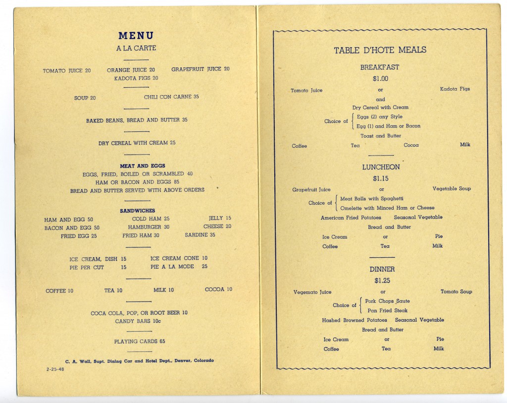 My Friend HERB RINGER loved to ride the trains. He often took the D&RGW and when he wasn’t aboard, he liked to photograph them as they passed by. This is from the early 50s, near Green River, Utah. Note the menu prices…JS