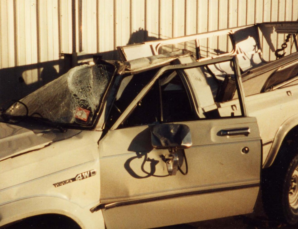 Next! January 18, 1989. Martin Luther King Day. US 191 between Price and Green River near milepost 54. Tom hits some black ice and loses control of his wife Robin’s Toyota pickup. The truck rolls three times and crushes the roof. The top of the cab is touching the gearshift knob. Tom is unconscious for 45 minutes. When he wakes up, he realizes battery acid is dripping on him, but he’s grateful for the acid because, “I figure that’s what woke me up.” He ends up in the Price hospital–concussion, stitches, cerebral hematoma, temporary loss of sight and hearing…..ho hum. Tom thinks, “I wonder what the wife will say about the truck?”