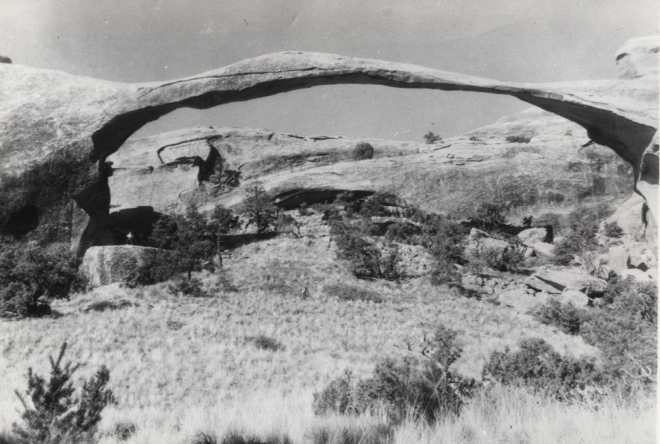 On the morning of May 29, 1950, Semisch and Ordway made their way down a rough sandy road to the Devils Garden. They bogged down in the sand at least once; a photographer from California, Stanley Midgeley pulled them out; they arrived at the trailhead at about the same time and all of them hiked north about a mile to Landscape Arch.