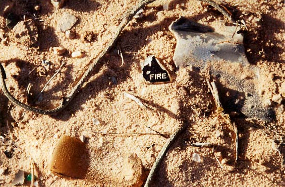 As I kicked a crumpled piece aluminum with my foot, I saw a small glass shard, less than an inch across. One word was clearly visible. It said: FIRE.