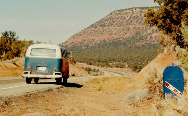 In the late 1970s, a standard blue US post office mailbox was installed along Utah Highway 95, a few miles east of Natural Bridges NM.