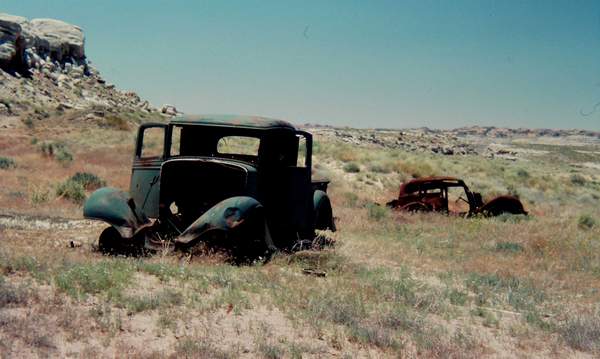 …you can see the ridge of Devils Garden in distance. (I believe these old cars were hauled away by the BLM in the mid-90s…said they were ‘eyesores.’)